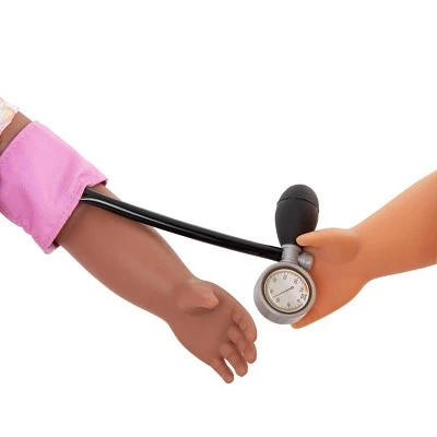 Take super care of your 18-inch dolls with the Our Generation Get Well Bed and realistic doctor accessories! Dress your doll in the hospital gown with the bracelet and have them rest on the adjustable bed – it easily elevates from flat to seated to keep your besties comfy. Which of your dolls has medical training? Play as the doctor by putting on the stethoscope to listen to your patient’s heartbeat, or test her reflexes with the cool reflex hammer! Wrap the leg cast around your doll’s foot and place it in the sling for extra support as she recovers. Don’t forget to fill out the forms to keep track of all the information – just like a real doctor does! After the checkup, keep the accessories neatly on the rolling service table and snuggle up under the comfy blanket for a speedy recovery! (Dolls sold separately)