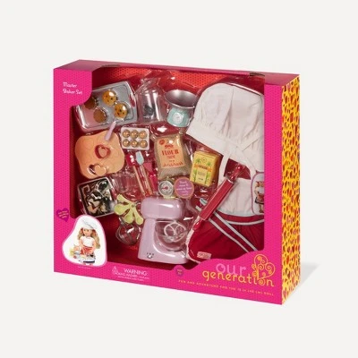 A sprinkle of sugar and a dollop of dreams are the perfect ingredients for hours of pretend baking fun with the Our Generation Master Baker Set, a baking accessory set for 18-inch dolls! Whether you’re practicing to be the next master chef or just making some sweet treats to share with your friends and family, this kitchen accessory set for dolls has everything you need. Dress your dolls in the adorable chef’s hat and apron to protect their outfits. Measure out your ingredients with the scale, measuring cups and spoons, scrape them into the stand mixer with the spatula, and turn it on – there are three mixer speed settings, so your baking will turn out just right! This set comes with all kinds of kitchen tools and sweet baked treats that are perfect for a picnic or a tea party. The only limit to what you can cook up with this doll baking set is your imagination! The dolls pictured are Noa and Jenny. (Dolls and outfits sold separately, available at Target. Compatible with American Girl dolls.)
